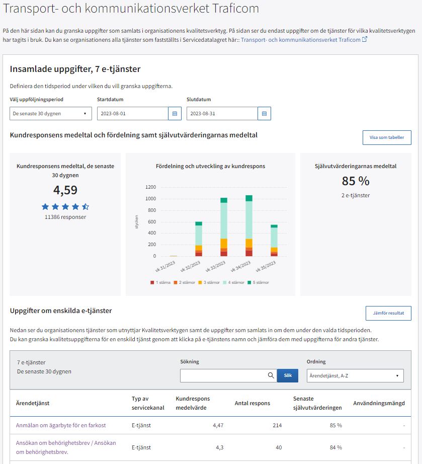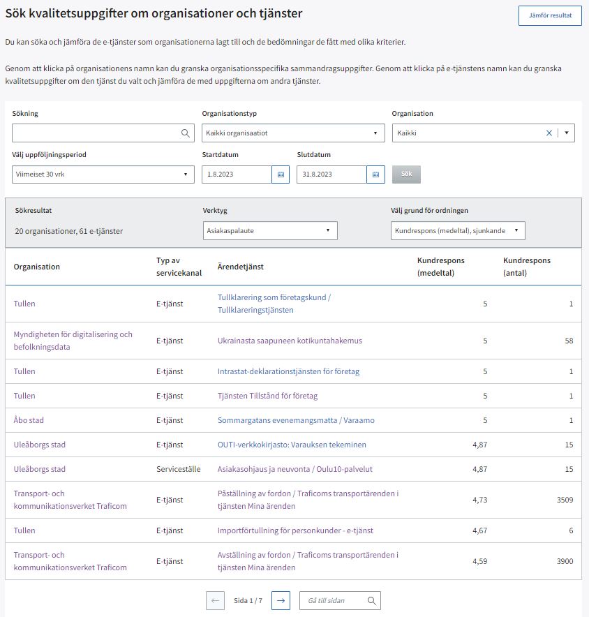 Redan tidigare har det varit möjligt att i Kvalitetsverktygens offentliga vy granska de bedömningar och resultat som en enskild tjänst fått. Användaren har kunnat göra en jämförelse med den valda jämförelsegruppen för en enskild tjänst, bl.a. enligt organisationstyp eller målgrupp. Jämförelsegruppens uppgifter fås från kategoriuppgifterna i Suomi.fi-servicedatalagret. Den nya egenskapen är en organisationsspecifik sammandragsvy med en förteckning över tjänster som använder den valda organisationens kvalitetsverktyg. På sidan finns en sammanställning av medeltalet, fördelningen och utvecklingen av kundresponsen för dessa tjänster samt självutvärderingsresultaten.