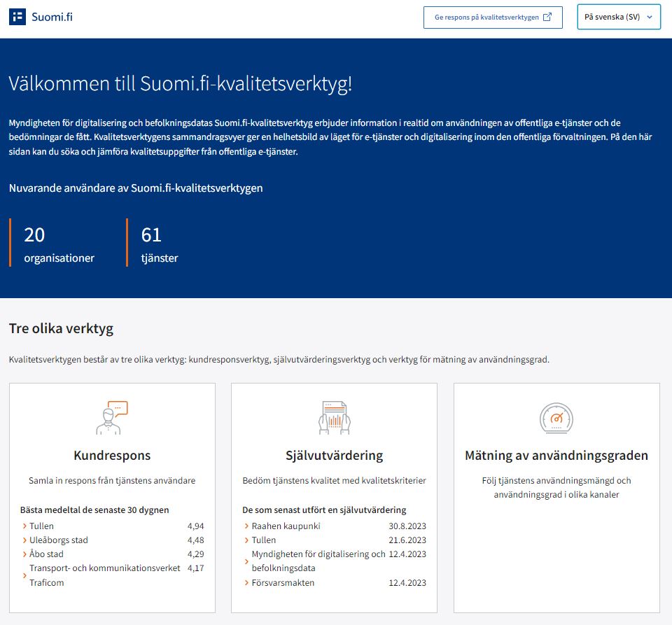 Med Suomi.fi-kvalitetsverktygen kan organisationerna inom offentlig förvaltning bedöma och följa upp kvaliteten på och användningen av sina e-tjänster. Dessutom synliggör Kvalitetsverktygen den information som samlas om kvaliteten på användarorganisationernas tjänster. Kvalitetsverktygens offentliga vy är öppen för alla. Den erbjuder ett sätt att jämföra den egna tjänsten med andras tjänster och bidrar till att förbättra ledning genom information.