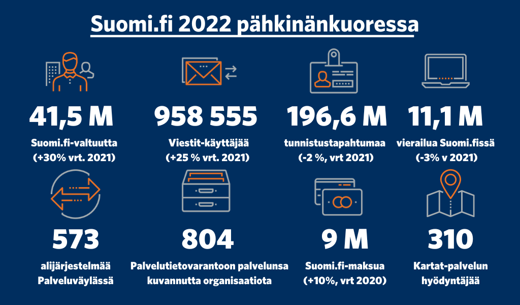 Suomi.fi-tunnistuspalvelun käyttö tasaantui koronapandemiavuosien kovan kasvun jälkeen. Suomi.fi-palveluväylään liittyneiden organisaatioiden määrä kasvoi yli 20 prosenttia. Palvelutietovarantoon liittyi uusia organisaatiota vuonna 2022 mukaan 119 kpl.
