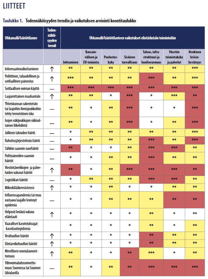 Sisäministeriö on julkaissut 31.1. Kansallisen riskiarvion 2018, jonka ohjauksesta on vastannut Turvallisuuskomitea. Sisäministeriön tiedotteessa todetaan, että ”Kansallinen riskiarvio kattaa 20 uhkamallia tai häiriötilannetta, jotka ovat Suomessa mahdollisia. Häiriötilanteet on jaettu yhteiskunnan vakauteen, teknologiaan ja logistiikkaan sekä terveysturvallisuuteen liittyviin uhkiin ja laajoihin onnettomuustilanteisiin. Samalla on arvioitu sitä, onko häiriöiden todennäköisyys kasvanut vai pysynyt ennallaan”. Alla oleva taulukko löytyy julkaisun liitteistä ja siinä on tiivistetysti kuvattuna uhkamallien ja häiriötilanteiden todennäköisyyksien trendit ja vaikutuksien arvioinnit.