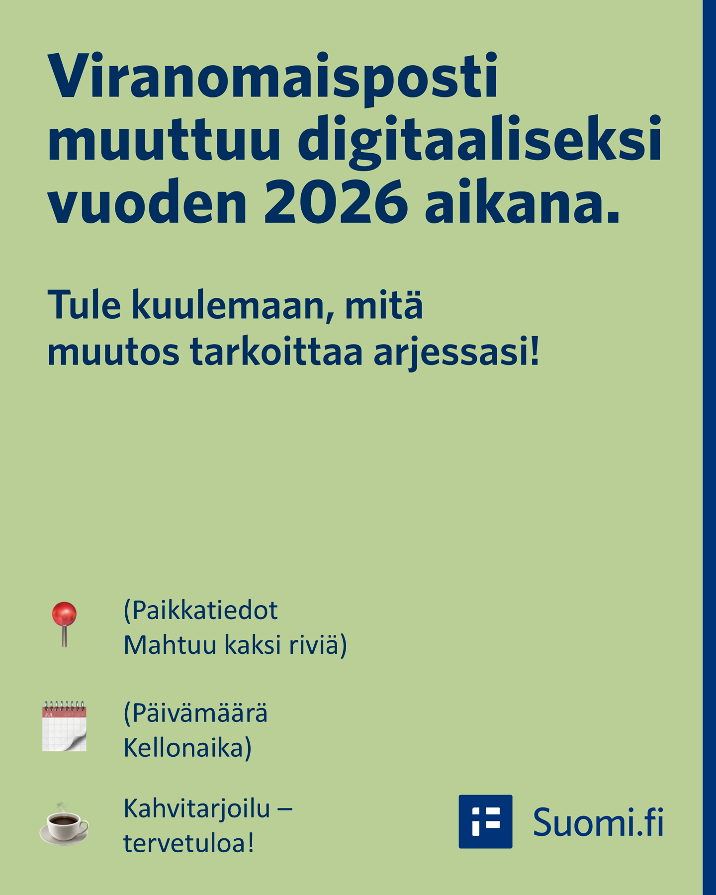 - 10.10.2025 — Viranomaisposti muuttuu vuonna 2026 digitaaliseksi – Viestintämateriaalia tarjolla julkisen hallinnon organisaatioille