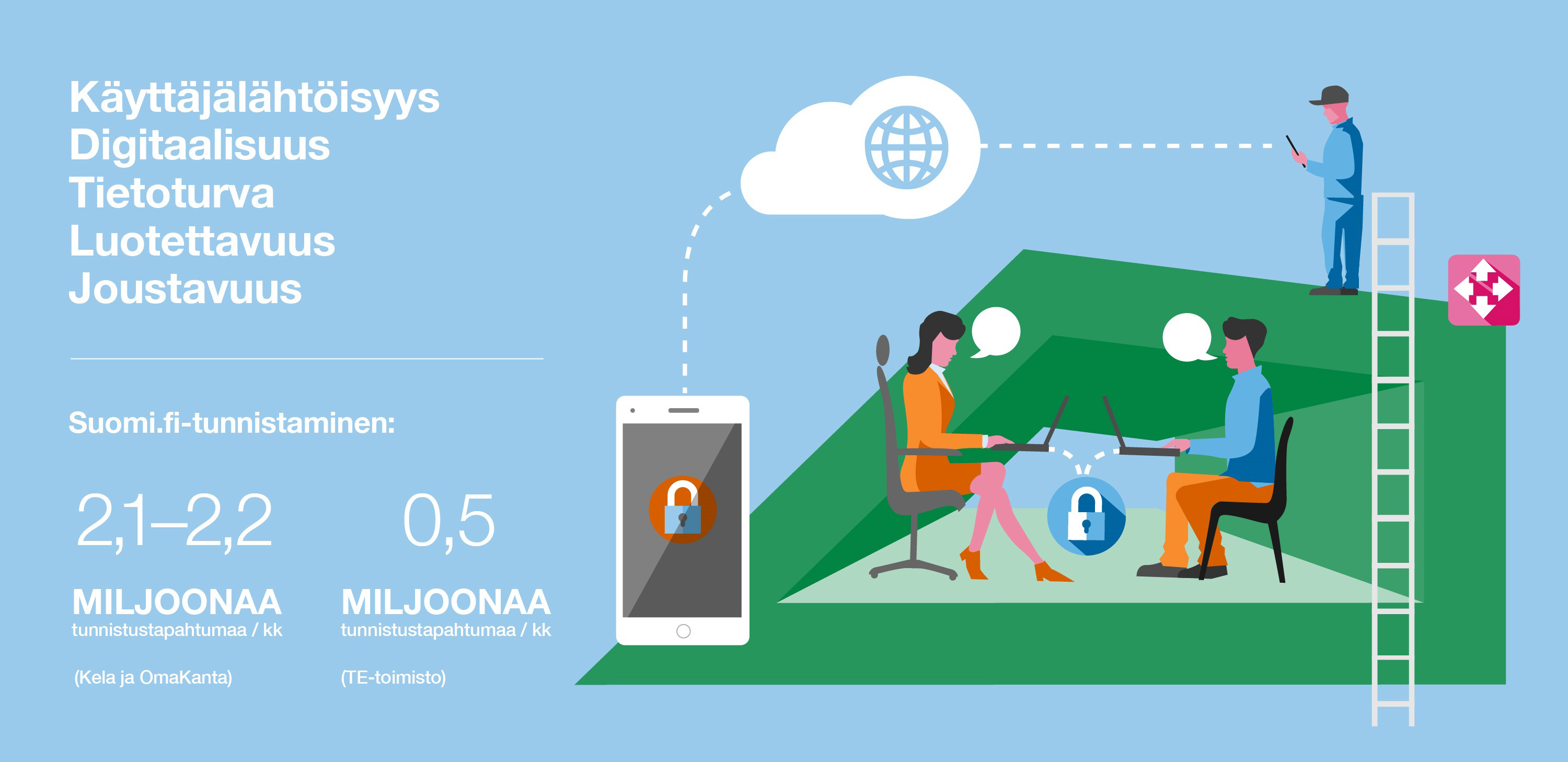 Sähköisen tunnistusratkaisun, Suomi.fi-tunnistamisen, osalta on tänä syksynä otettu tärkeitä edistysaskeleita. Lokakuussa Suomi.fi-tunnistaminen otettiin käyttöön TE-palveluiden sähköisessä asioinnissa. TE-palveluissa on noin 0,5 miljoonaa tunnistustapahtumaa kuukaudessa. Marraskuun viimeisenä viikonloppuna Kela siirtyi käyttämään Suomi.fi-tunnistamista kela.fi-tapahtumien osalta. Kela tulee ottamaan tunnistuksen loppuvuodesta käyttöön myös OmaKanta-palvelussa, jolloin kuukausittainen tunnistustapahtumien määrä Kelan osalta on yhteensä 2,1-2,2 miljoonaa.