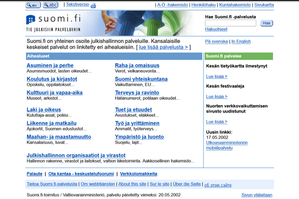 Suomi.fi-verkkotoimitus perustetaan valtioneuvoston tietohallintoyksikköön vuonna 2002.