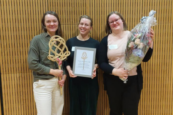 Kuva: Suomi.fi-verkkotoimituksesta Minna Mäkinen, Anniina Väisänen ja palveluomistaja Terhi Tuokkola vastaanottavat Vuoden selväsanainen -palkinnon.