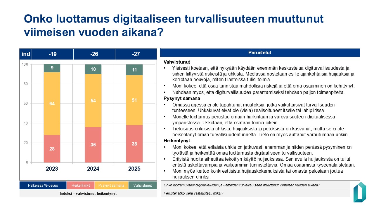 Tulosten mukaan 38 % vastaajista kokee luottamuksensa digiturvaan heikentyneen, kun taas yli puolella (51 %) luottamus on säilynyt ennallaan. Vain 11 % kertoo luottamuksen vahvistuneen.