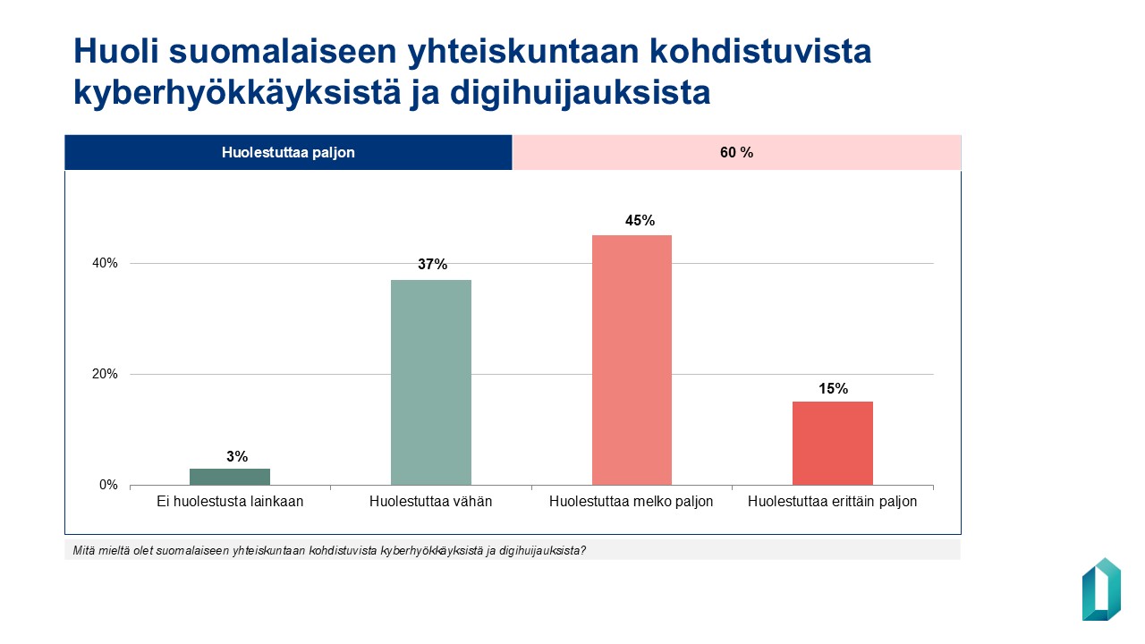 Tämän vuoden tutkimuksessa kysyttiin ensimmäistä kertaa suhtautumisesta kyberuhkiin. Kyberuhat huolettavat laajasti: 60 % suomalaisista on melko tai erittäin huolissaan yhteiskuntaan kohdistuvista kyberhyökkäyksistä ja digihuijauksista. Silti vastaajista 51 % uskoo, että Suomi on varautunut niiden torjuntaan hyvin. Kaksi kolmesta arvioi digiturvan olevan paremmalla tasolla Suomessa kuin muissa EU-maissa.