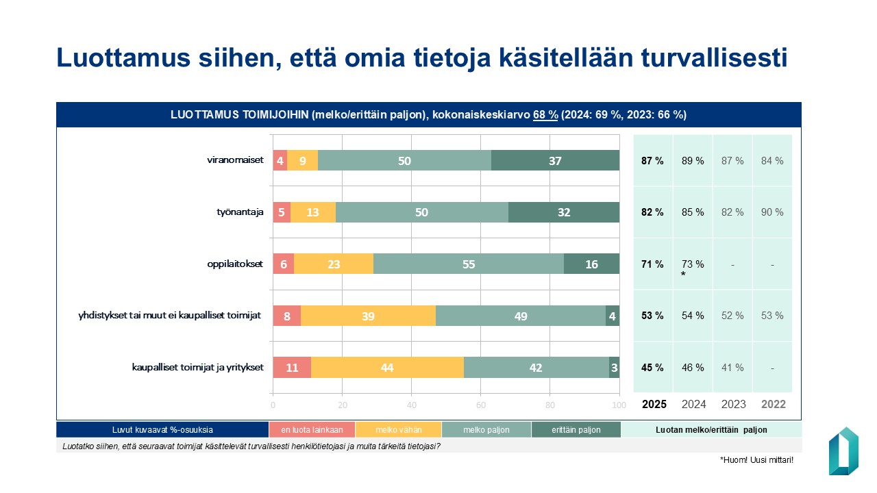 Vaikka tutkimuksessa nousi esille huolia, luottamus viranomaisiin, finanssialaan ja omaan työnantajaan on säilynyt korkeana. Viranomaisiin luottaa 87 %, työantajaan 82 %, oppilaitoksiin 71 % ja finanssialaan 87 %.