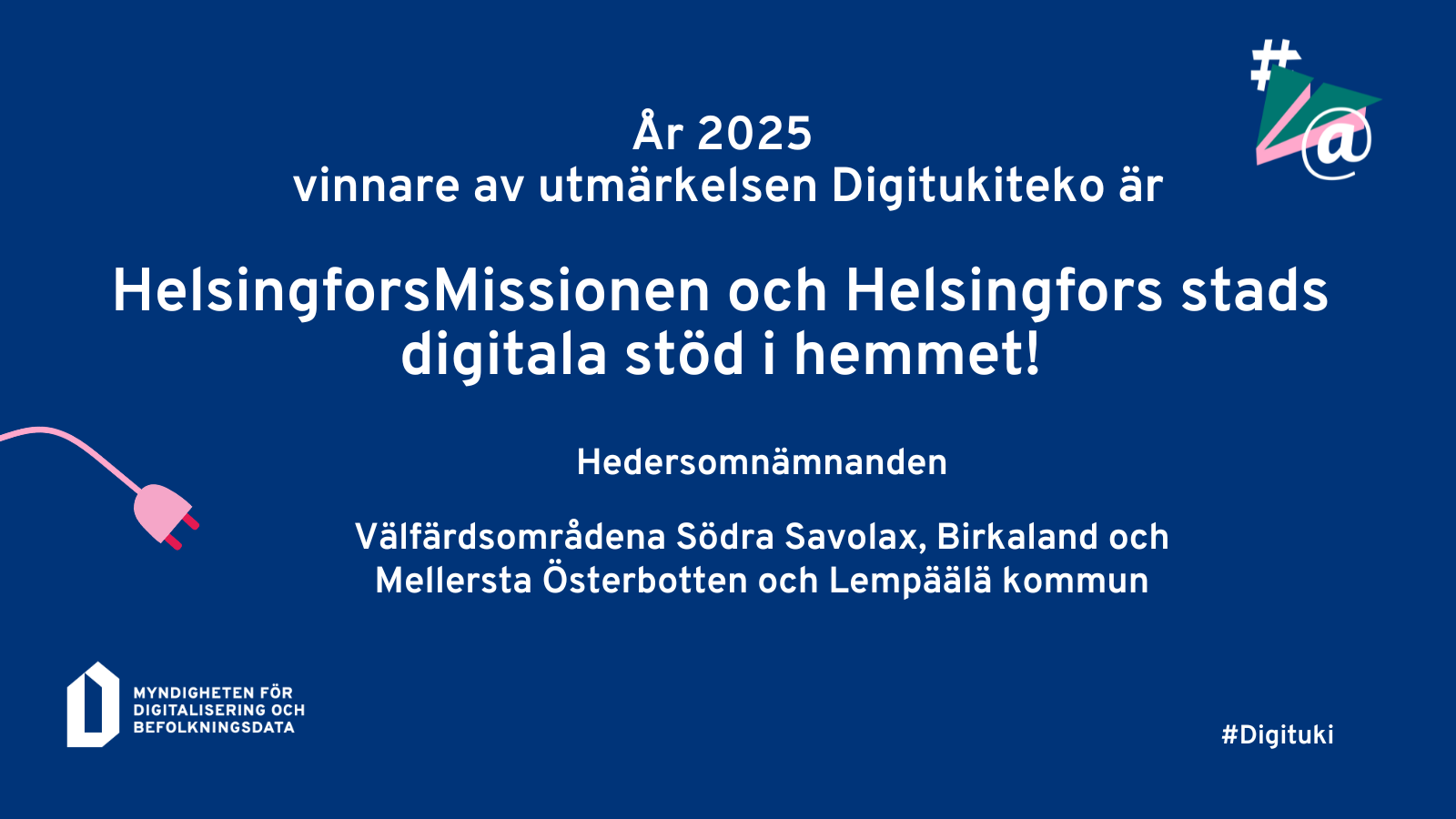 Utmärkelsen Digitukiteko beviljas årligen för en insiktsfull och kundorienterad utveckling av digitalt stöd och digital kompetens. Utmärkelsen är en del av Myndigheten för digitalisering och befolkningsdatas riksomfattande utvecklingsarbete för digitalt stöd och mottagaren väljs av en jury som byts ut årligen. I fjol gick utmärkelsen till Mansikka ry:s kampanj ”Henkkarit kaikille”, som förbättrade tillgången till identitetsbevis.