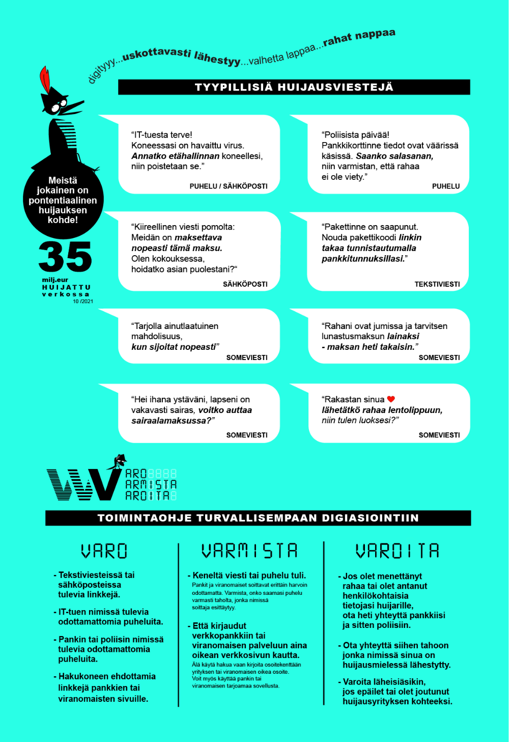 Lisätietoja eri huijaustyyleistä, kampanjamateriaaleja sekä linkkejä aikaisempiin ohjeisiin ja tutkimuksiin löytyy osoitteesta huijausinfo.fi.