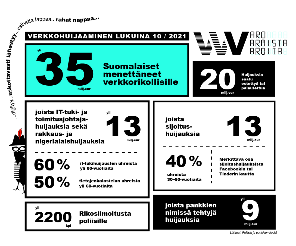 Suomalaiset ovat menettäneet tänä vuonna jo kymmeniä miljoonia euroja verkkorikollisille. Finanssialan toimijat, Liikenne- ja viestintäviraston Kyberturvallisuuskeskus, Kuluttajaliitto, Poliisi, Digi- ja väestötietovirasto, Kela ja Microsoft tekevät yhteistyötä, jotta yhä harvempi lankeaisi rikollisten huijauksiin.