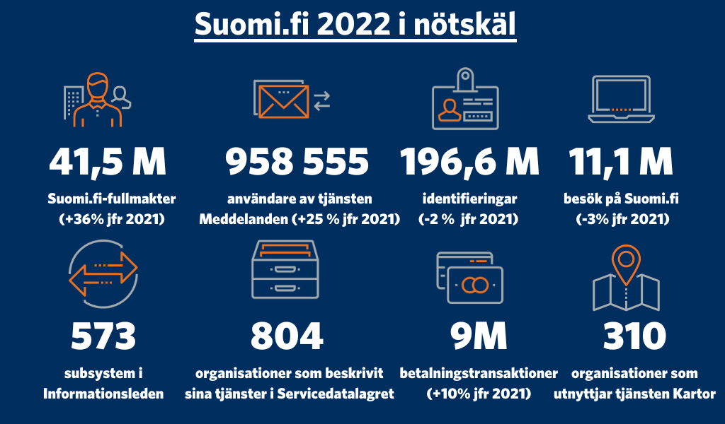 - Suomi.fi-webbtjänsten besöktes 11,1 miljoner gånger 2022 (2021 var antalet besök 11,4 miljoner).