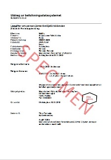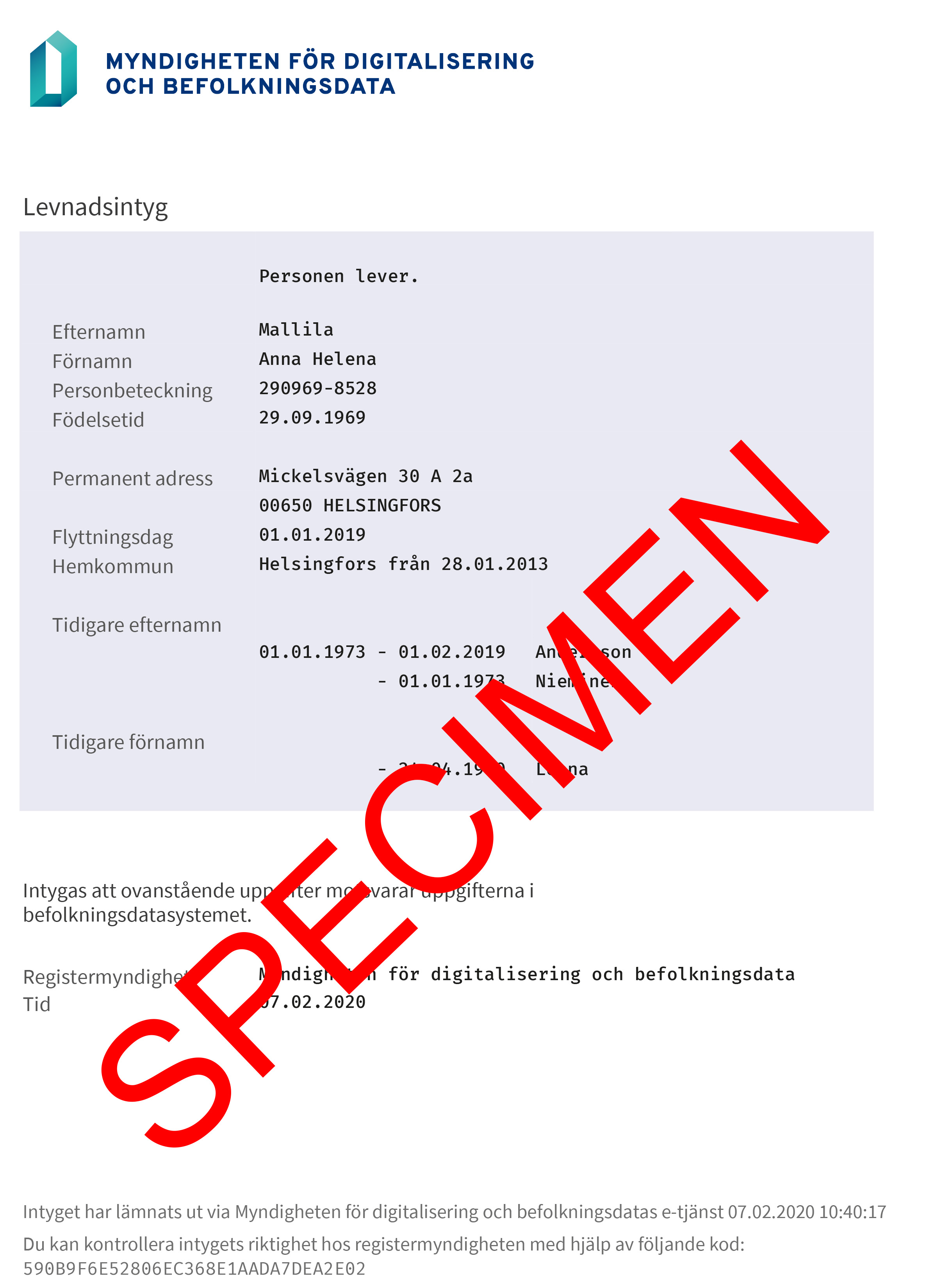 Det elektroniska intyget innehåller inte en stämpel från Myndigheten för digitalisering och befolkningsdata. Intygets riktighet kan kontrolleras hos Myndigheten för digitalisering och befolkningsdata med hjälp av koden på intyget. Anvisningar finns på slutet av sidan.