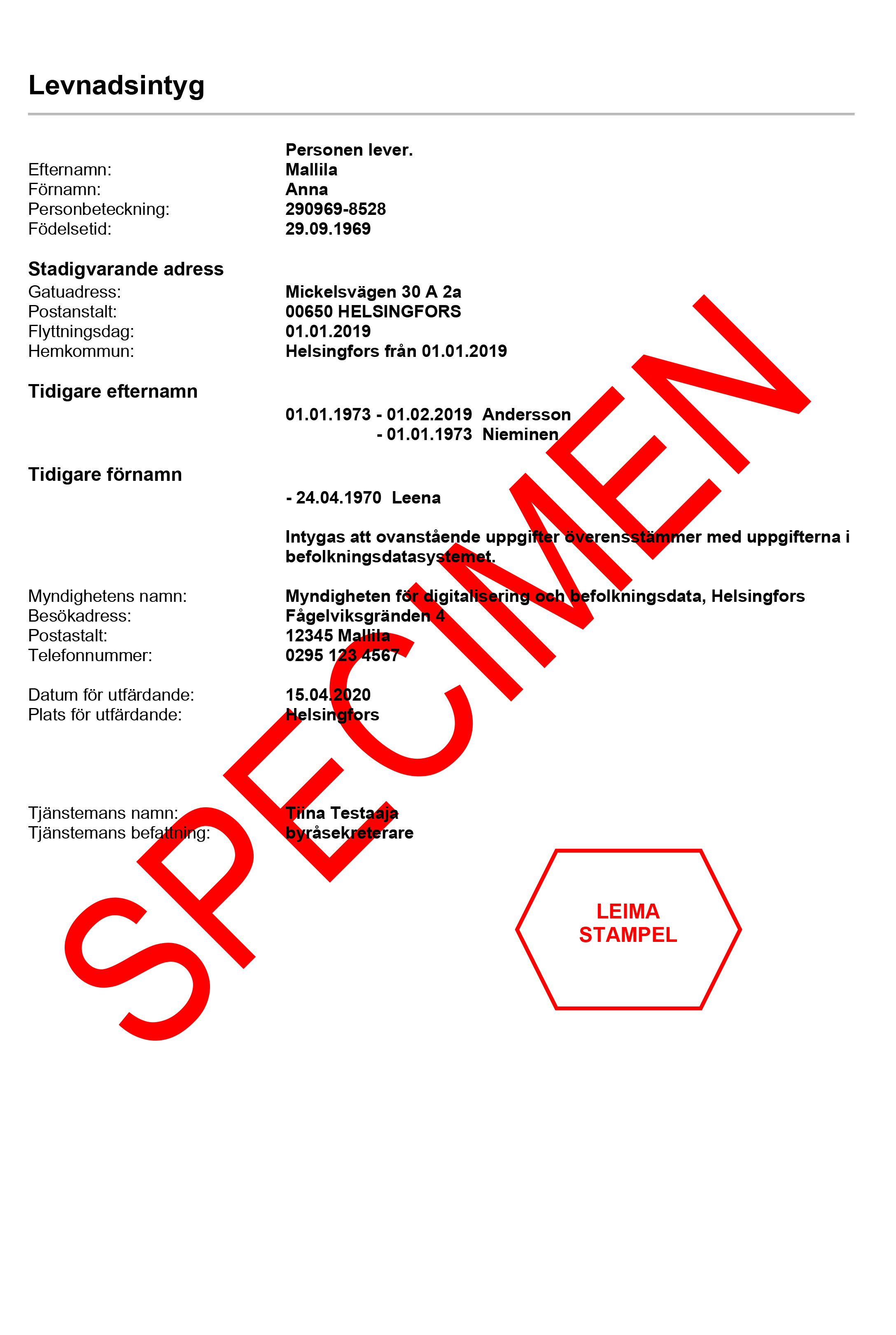 Obs! Befolkningsregistercentralen och magistrater sammanslogs från 2020 till Myndigheten för digitalisering och befolkningsdata. Det kan finnas intyg som är giltiga antingen med magistratens eller Myndigheten för digitalisering och befolkningsdatas logo.