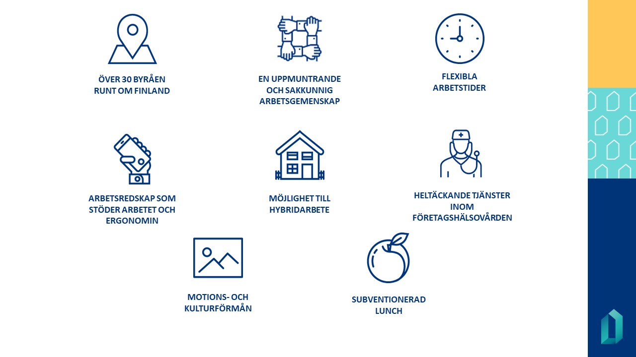 Vi erbjuder som arbetsgivare möjlighet att delta i utvecklandet av digitala tjänster och tjänster som utgår från livssituationen samt möjlighet till samhällspåverkan. Vid ämbetsverket arbetar man till exempel med person- och organisationskunder, men också med samhälleliga utvecklingsprojekt och projekt i anslutning till främjande av digitalisering. Gemensamt för oss alla är målet att främja ett smidigare Finland.